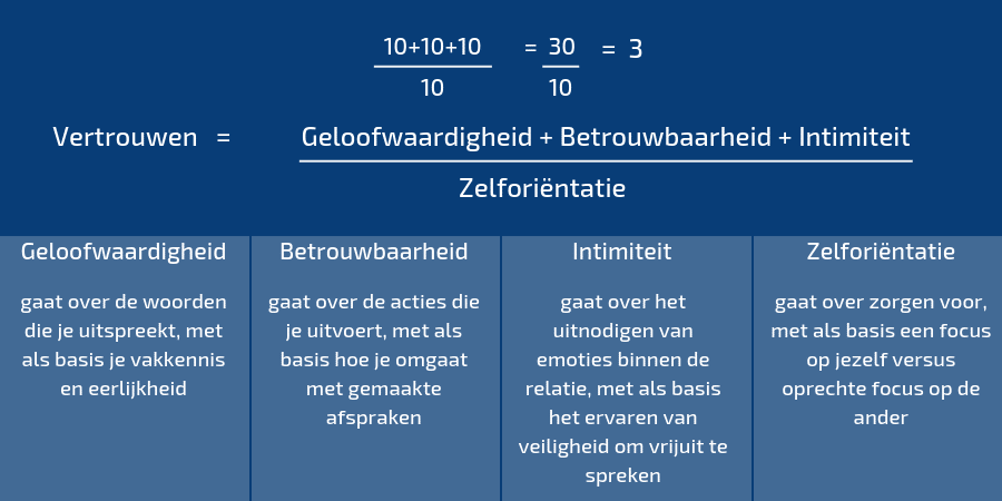 Om antwoord te geven op bovenstaande vragen is het zinvol om de vertrouwensformule van David Maister te introduceren. Hij stelt dat de mate waarin je van anderen vertrouwen krijgt de uitkomst is van: Geloofwaardigheid + Betrouwbaarheid + Intimiteit.